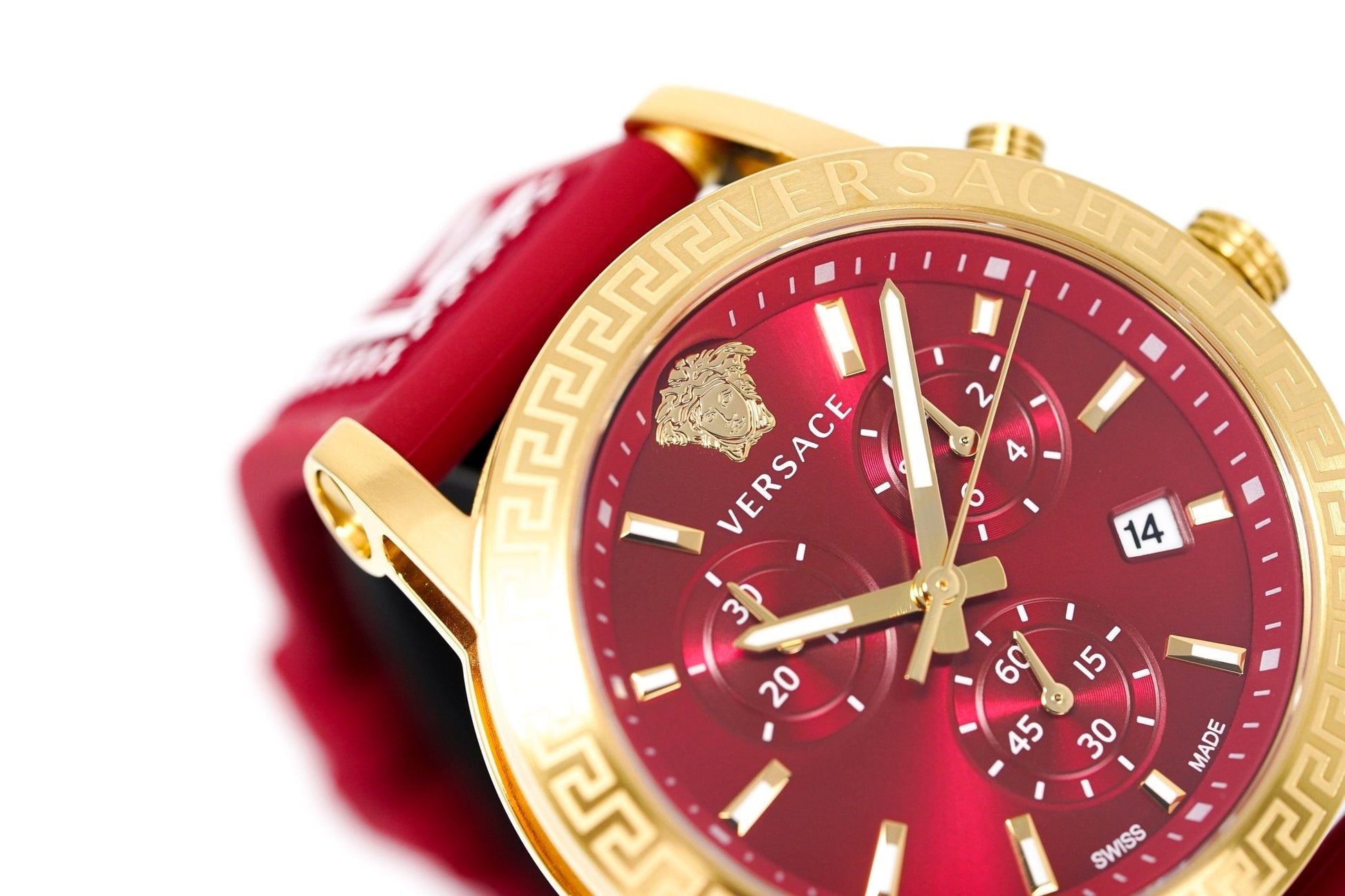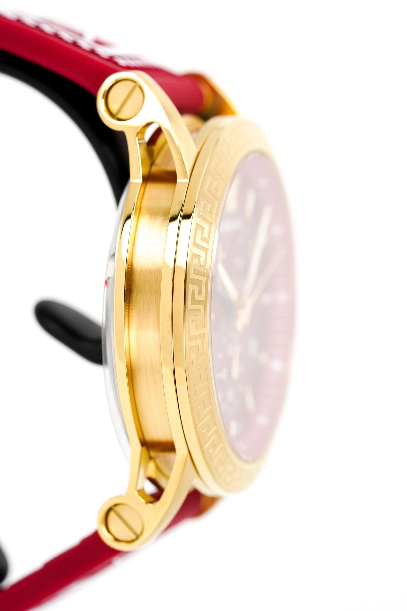 Dial: Red Dial - Gold Plated Luminous Hour Markers - Luminous Hands - 3 Sub-Dials with a 10-Hour Counter at 3 O'Clock, 30-Minute Counter at 9 O'Clock, and 60 Seconds at 6 O'Clock - Date Window at 4 O'Clock - PVD Gold Medusa Head at 12 O'Clock.