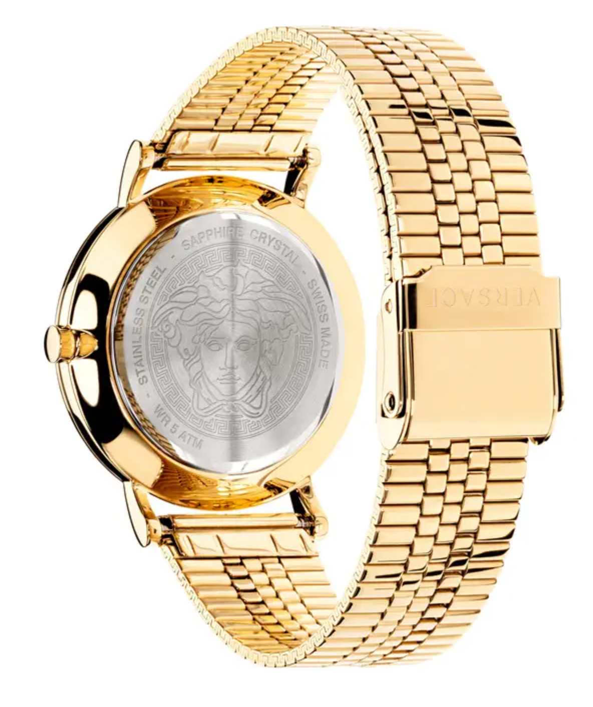 Case: 36mm x 7mm Gold IP Polished 316L Stainless Steel Case - Solid Stainless Steel Caseback with Versace Engraving - Anti-Reflective Sapphire Crystal Glass - Push-Pull Crown.