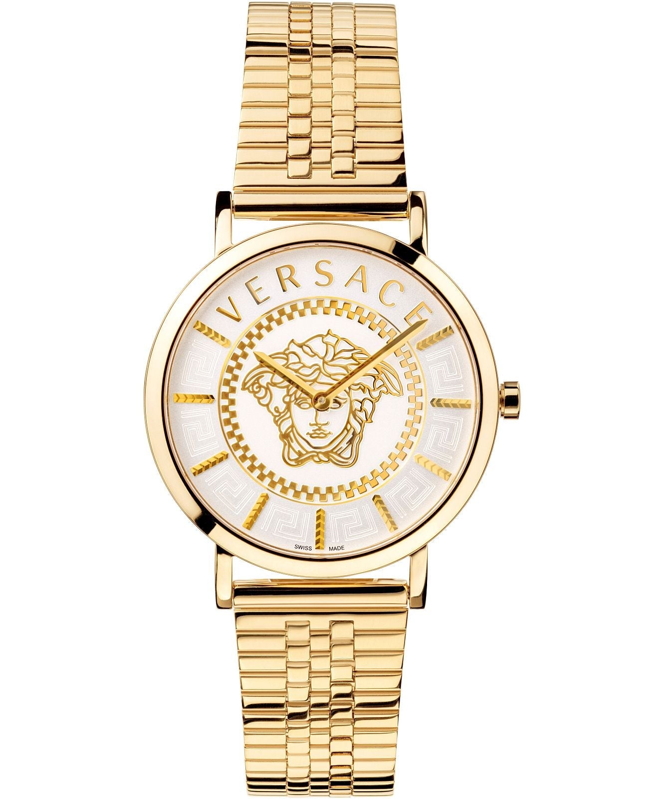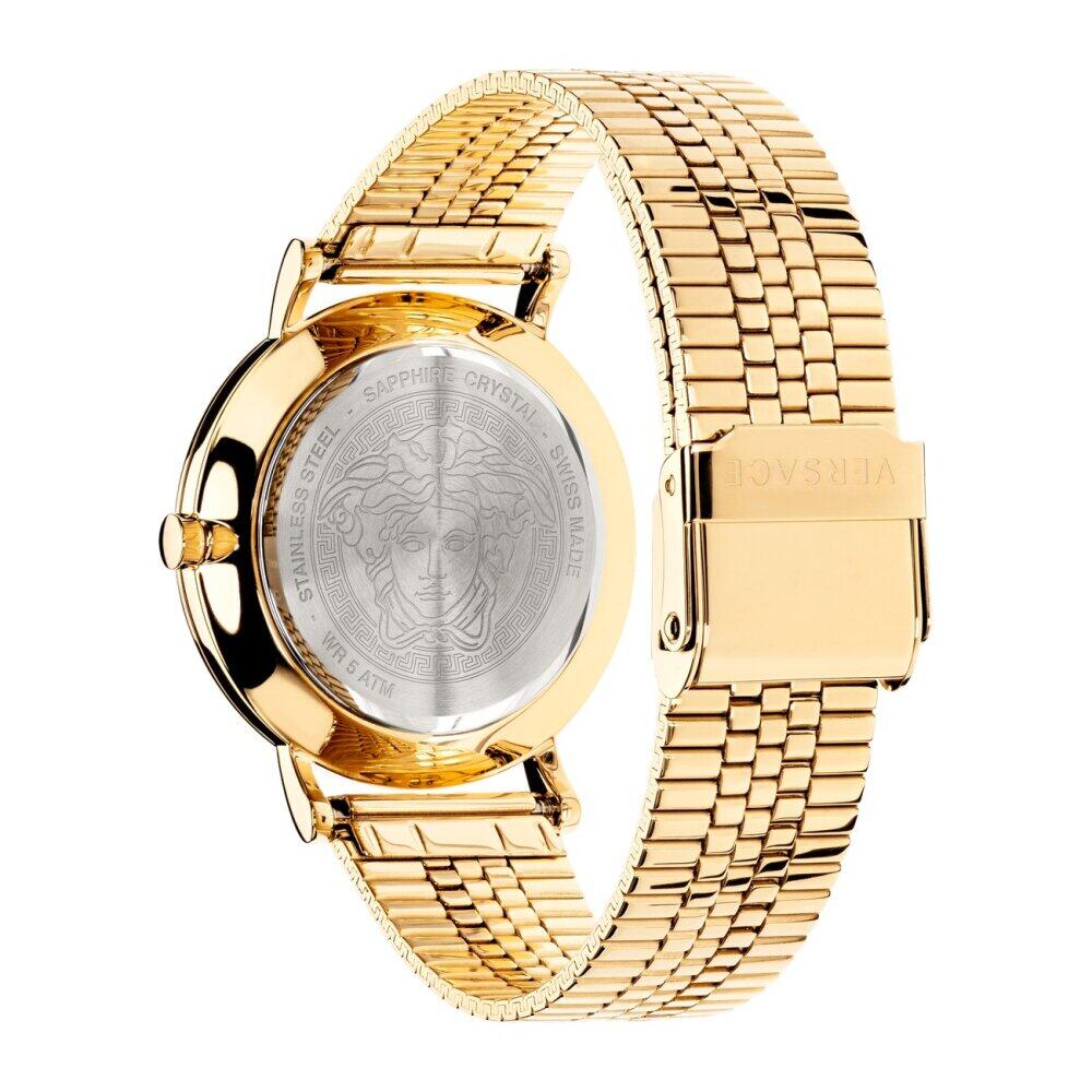 Case: 36mm x 7mm Gold IP Polished 316L Stainless Steel Case - Solid Stainless Steel Caseback with Versace Engraving - Anti-Reflective Sapphire Crystal Glass - Push-Pull Crown.