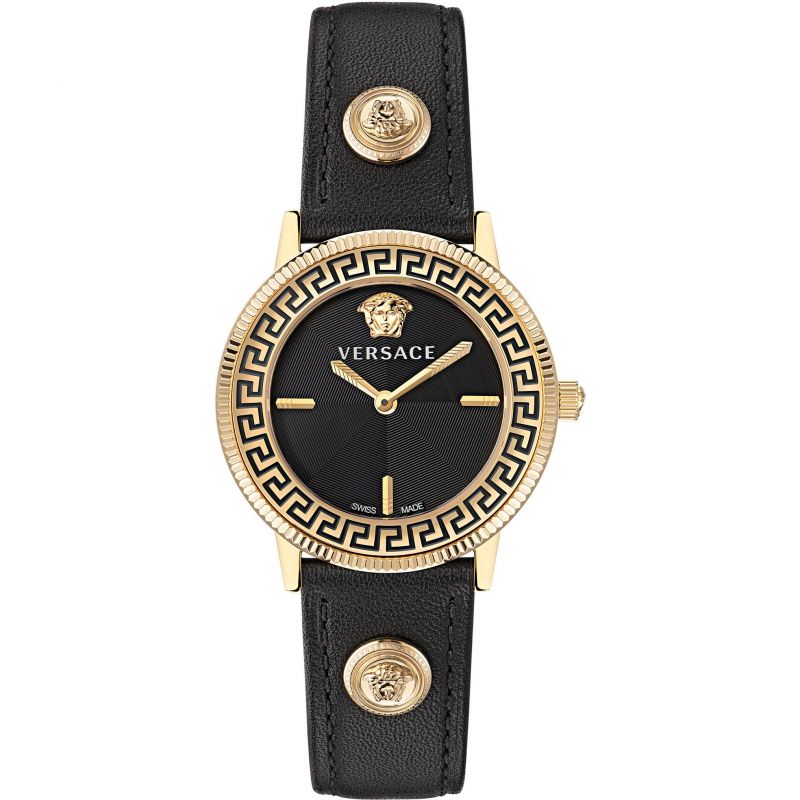 Strap / Bracelet: 18mm Lug Width Black Leather Strap with Gold Plated 316L Stainless Steel Engraved Versace Logo Deployment Clasp.
