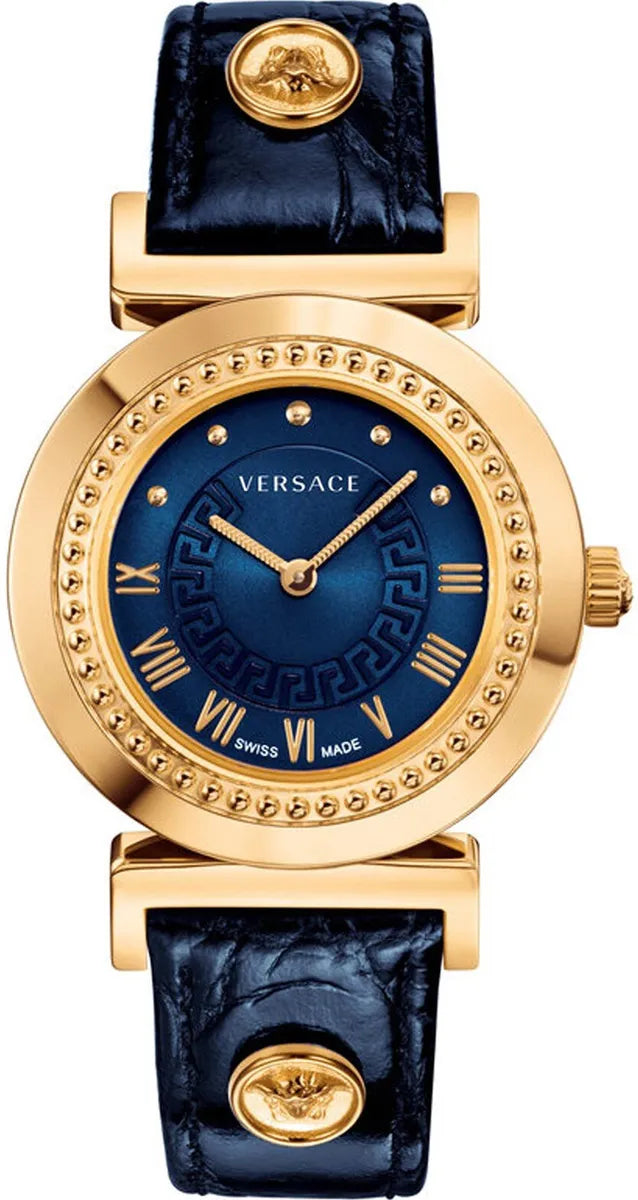Strap / Bracelet: 18mm Lug Width Blue Calf Leather Strap with Medusa Head on Each Strap and Versace Engraved Gold Plated Stainless Steel Hidden Butterfly Clasp.