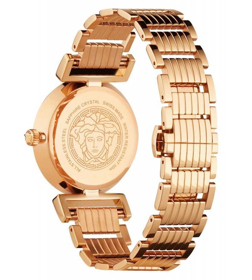 Case: 35mm x 8mm Gold Plated 316L Stainless Steel Case and Bezel - Screwed Down Stainless Steel Case Back with Medusa Head Engraving - Sapphire Crystal Glass - Push/Pull Crown.