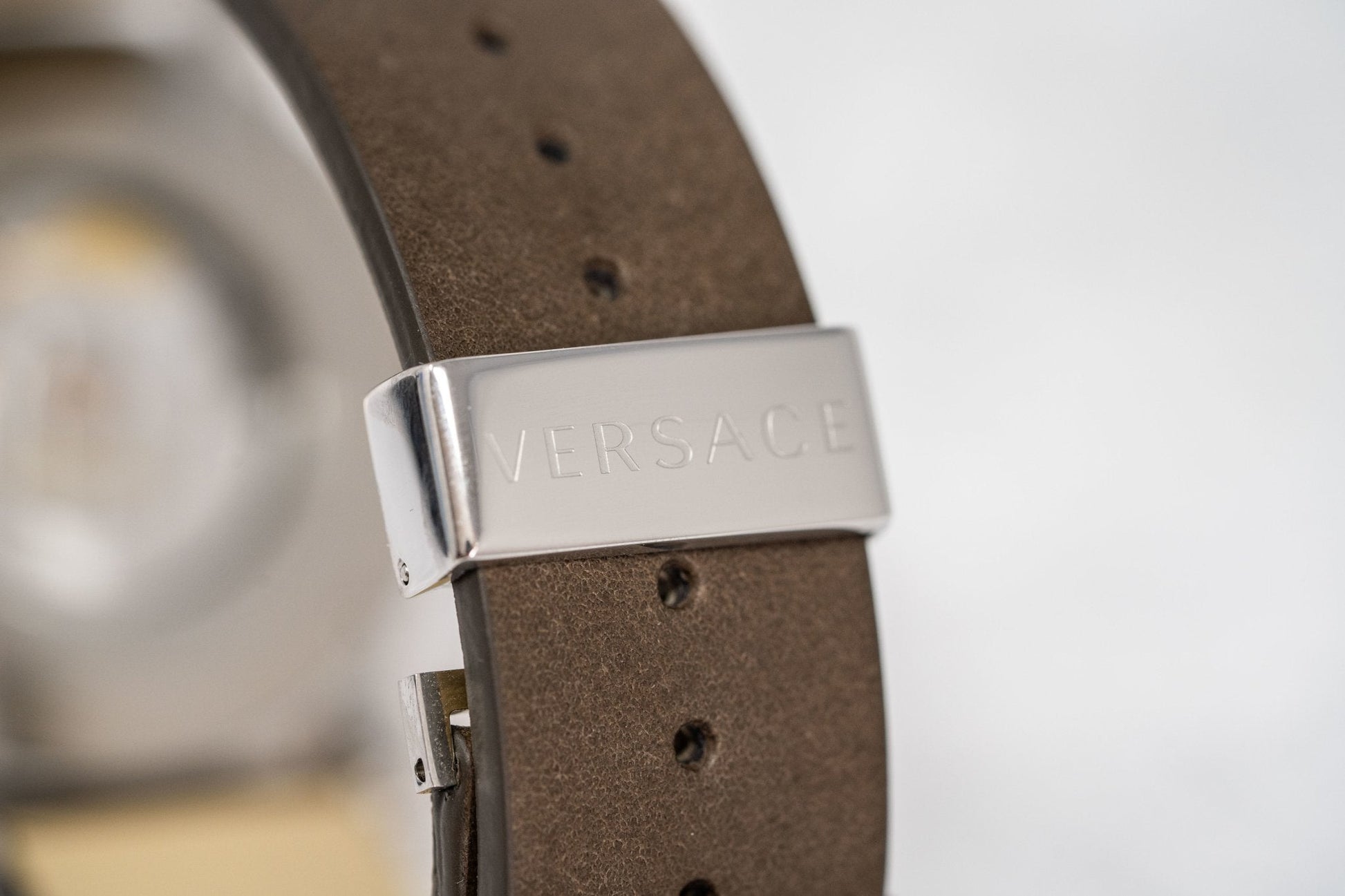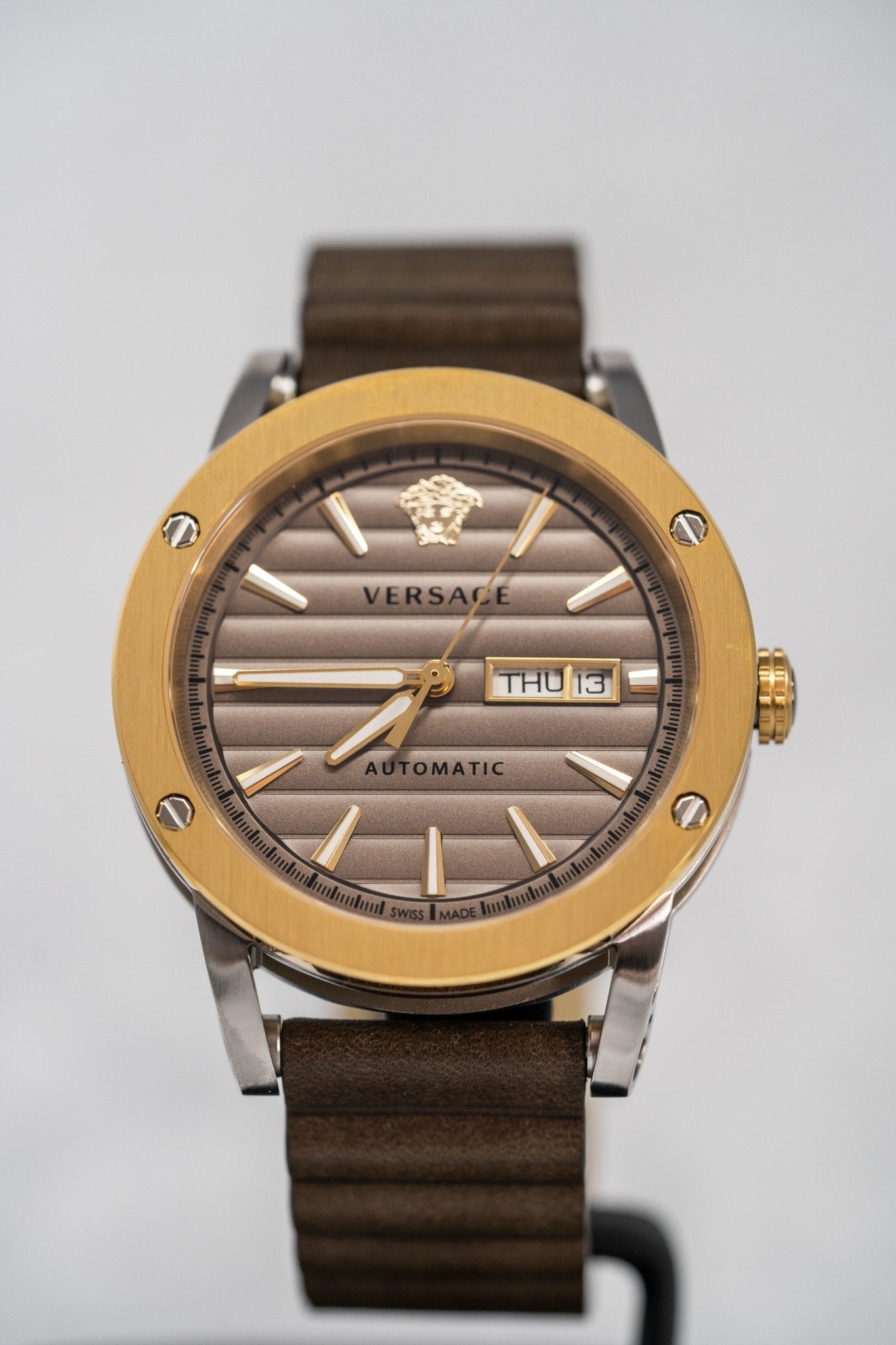 Dial: Brown Textured Dial - Stainless Steel Applied Luminous Markers and Hands - Date & Day Window at 3 O'Clock - Versace Medusa Logo at 12 O'Clock