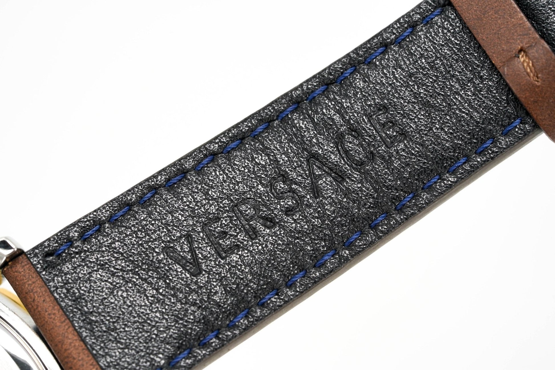 Case: 42mm x 11.5mm Brushed/Polished 316L Stainless Steel Case - Two-Tone Gold PVD Plated 316L Stainless Steel and Blue Bezel - Scratch Resistant Sapphire Crystal - Push-Pull Crown - Solid Caseback with Medusa Head Engraving.