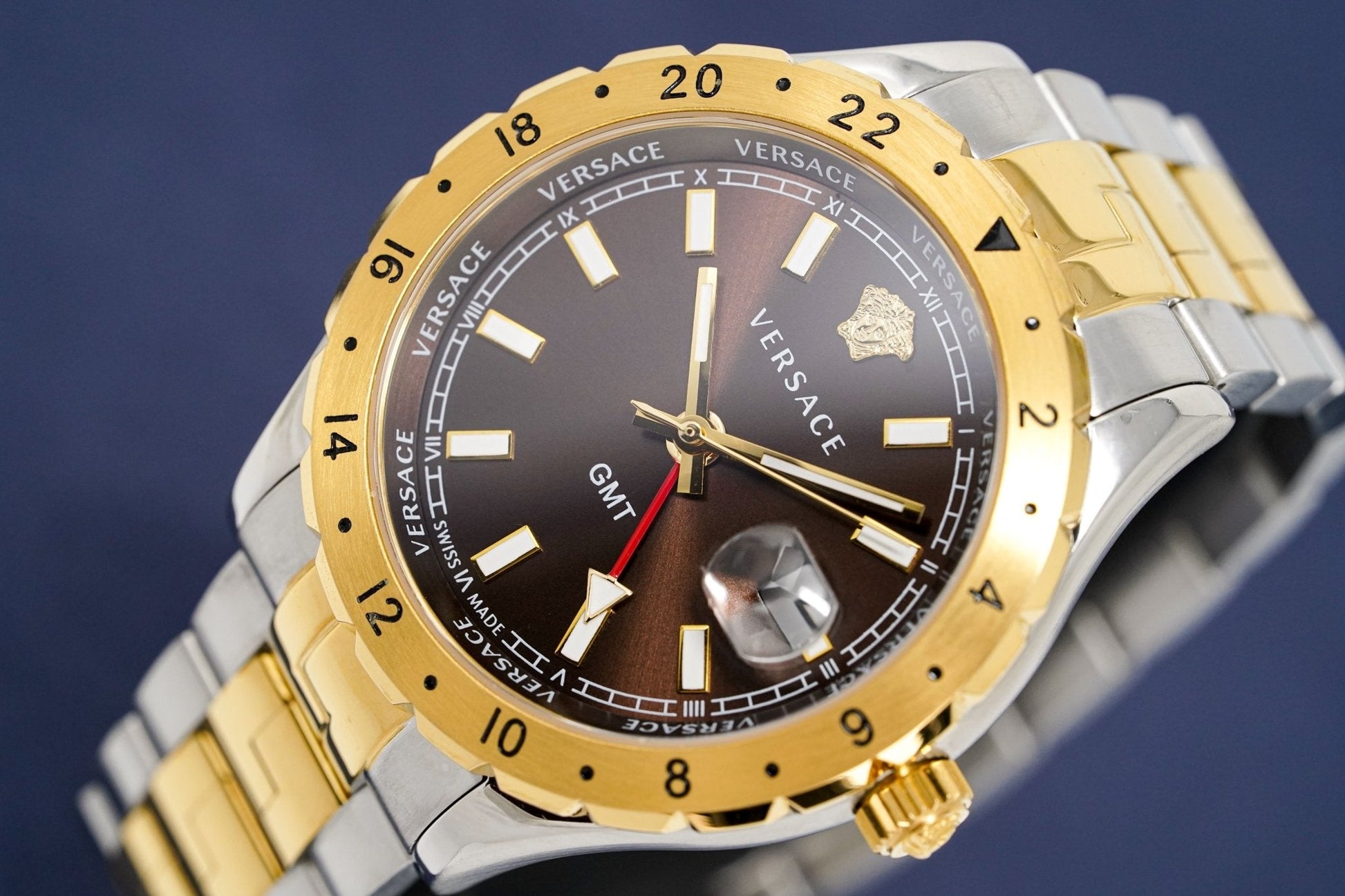 Dial: Brown Sunray Dial - Gold PVD Plated 316L Stainless Steel Luminous Markers and Hands - Red GMT Hand - Date Window at 3 O'Clock with Versace Medusa Logo at 12 O'Clock