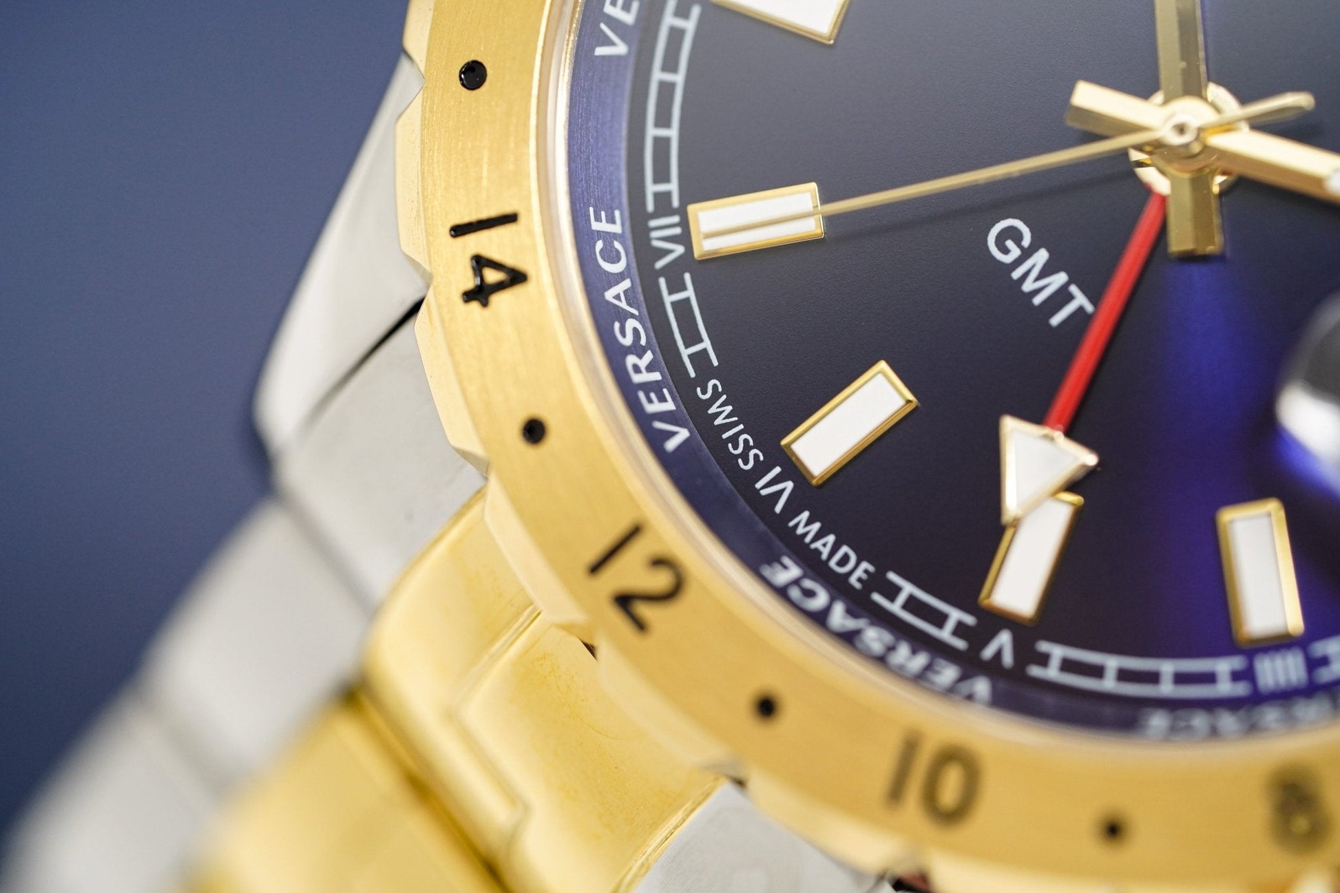 Dial: Blue Sunray Dial - Gold PVD Plated 316L Stainless Steel Luminous Markers and Hands - Red GMT Hand - Date Window at 3 O'Clock with Versace Medusa Logo at 12 O'Clock