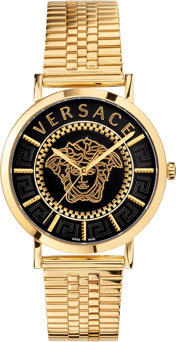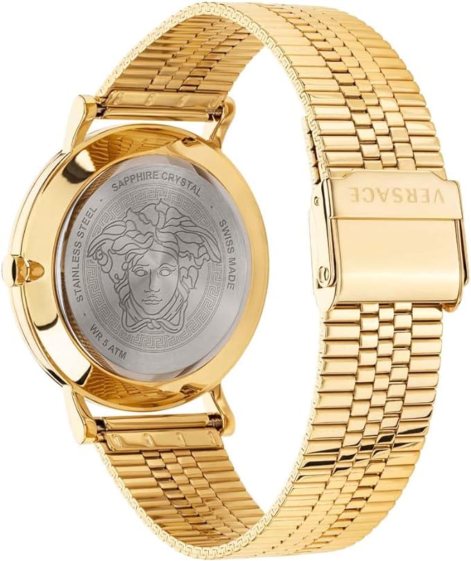 Case: 40mm x 12mm Gold IP Polished 316L Stainless Steel Case - Solid Stainless Steel Caseback with Versace Engraving - Anti-Reflective Sapphire Crystal Glass - Push-Pull Crown.