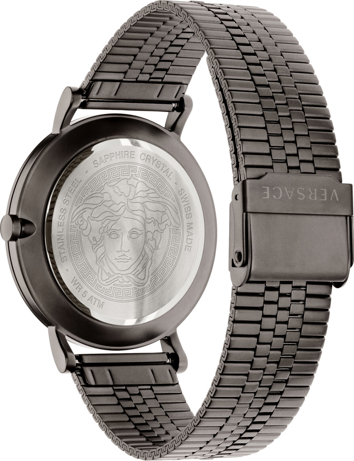 Case: 40mm x 12mm Black IP 316L Stainless Steel Case - Solid Stainless Steel Caseback with Versace Engraving - Anti-Reflective Sapphire Crystal Glass - Push-Pull Crown.