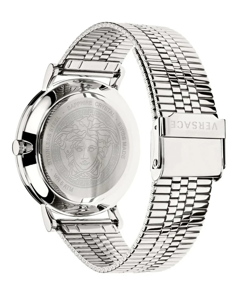 Case: 40mm x 12mm Polished 316L Stainless Steel Case - Solid Stainless Steel Caseback with Versace Engraving - Anti-Reflective Sapphire Crystal Glass - Push-Pull Crown.