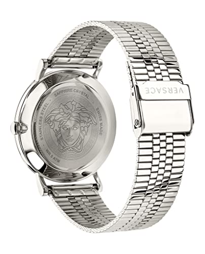 Case: 40mm x 12mm Polished 316L Stainless Steel Case - Solid Stainless Steel Caseback with Versace Engraving - Anti-Reflective Sapphire Crystal Glass - Push-Pull Crown.