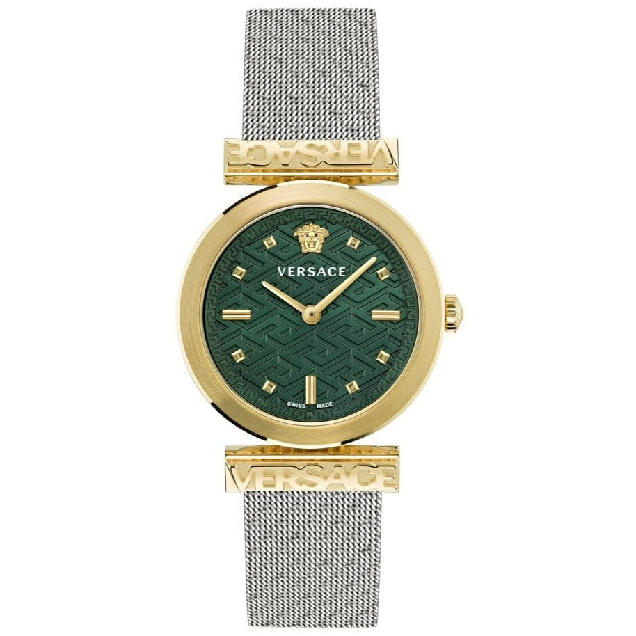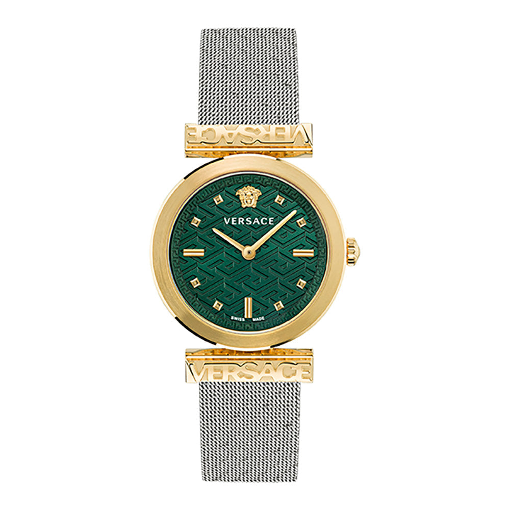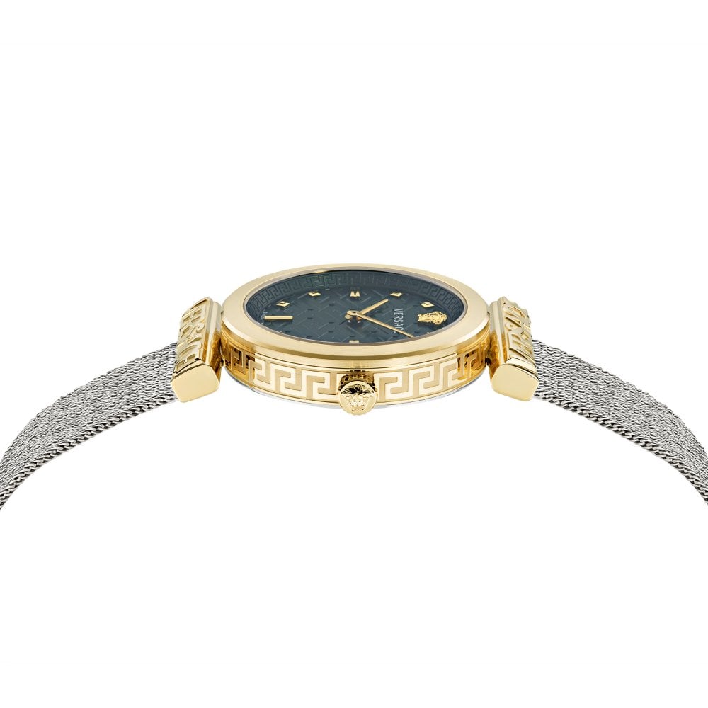 The Versace insignia, which is easily recognized, can be seen on the lugs that surround the dial in this elegant timepiece. The renowned 3D la Greca pattern and a 3D Medusa at 12 o'clock enhance the dial. The range is offered in both vibrant leather straps and attractive mesh bands.