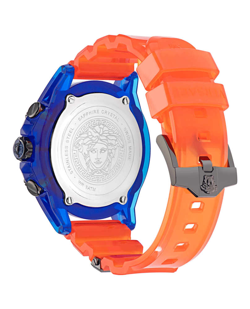 Case: 44mm x 14.5mm Blue Transparent Polycarbonate Case with Versace Engraving on Bezel - Solid 316L Stainless Steel Caseback with Medusa Head Engraving - Anti-Reflective Sapphire Crystal Glass - Push-Pull Crown.