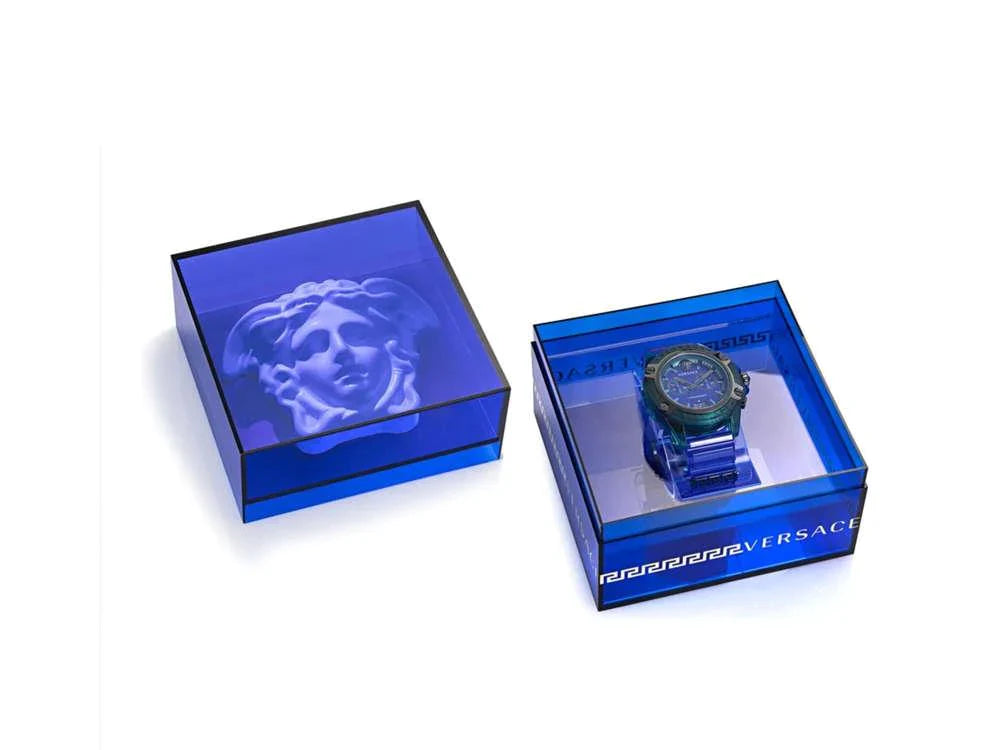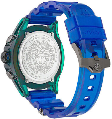 Case: 44mm x 14.5mm Green Transparent Plastic Case with Versace Engraving on Bezel - Solid 316L Stainless Steel Caseback with Medusa Head Engraving - Anti-Reflective Sapphire Crystal Glass - Push-Pull Crown.