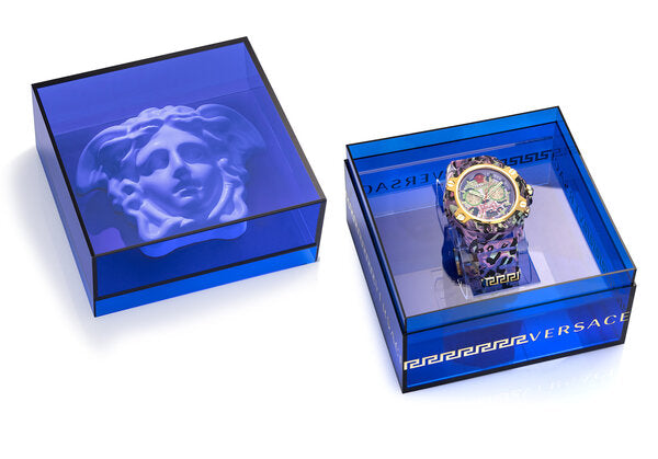 Case: 44mm x 14.5mm Lilac Leopard Print Transparent Polycarbonate Case with Versace Engraving on Bezel - Solid 316L Stainless Steel Caseback with Medusa Head Engraving - Anti-Reflective Sapphire Crystal Glass - Push-Pull Crown.