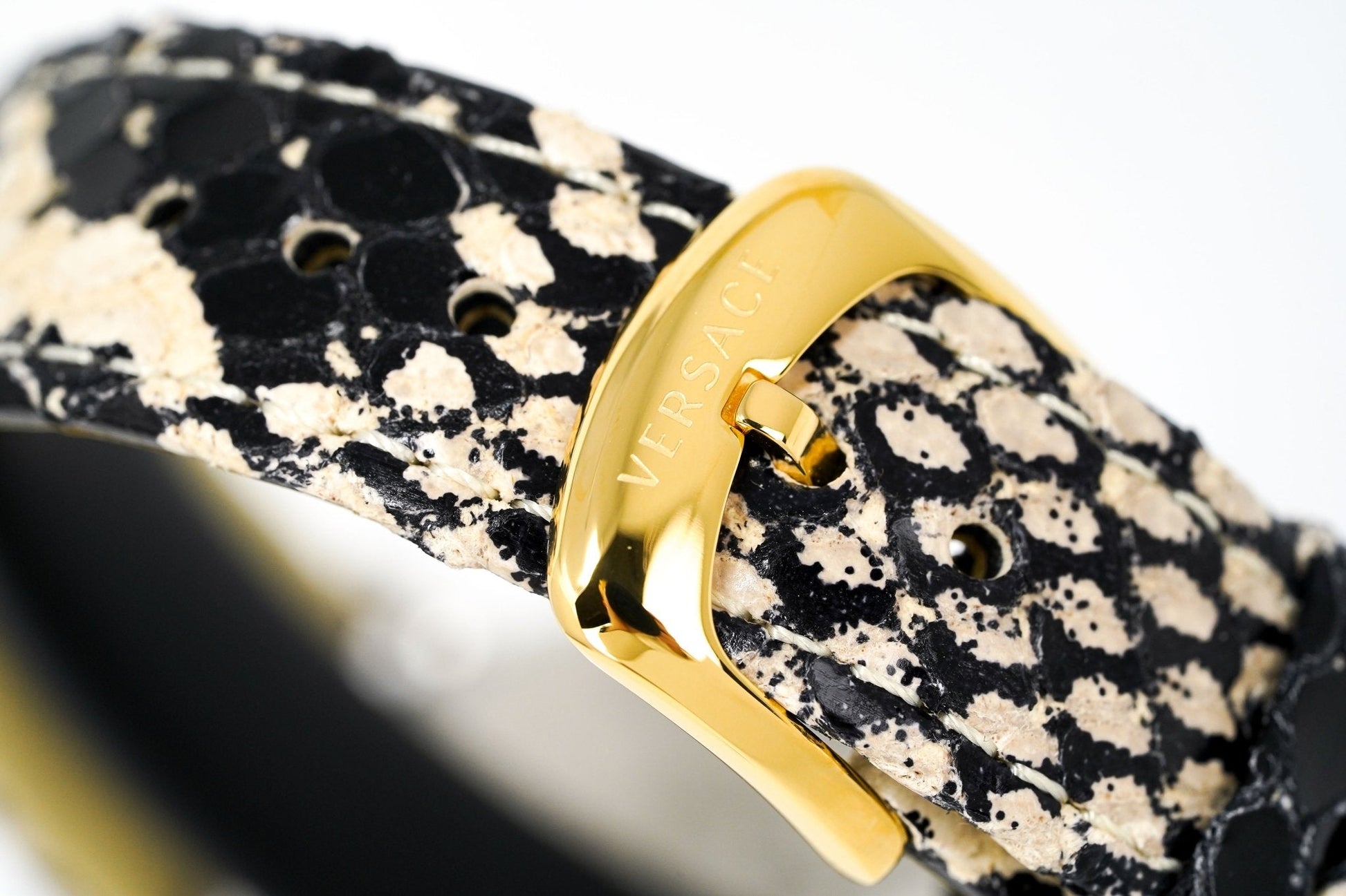 18mm x 16cm Imitation Snake Skin Leather Strap with Gold Plated "VERSACE" Lettering and Versace Engraved Pin-Buckle.