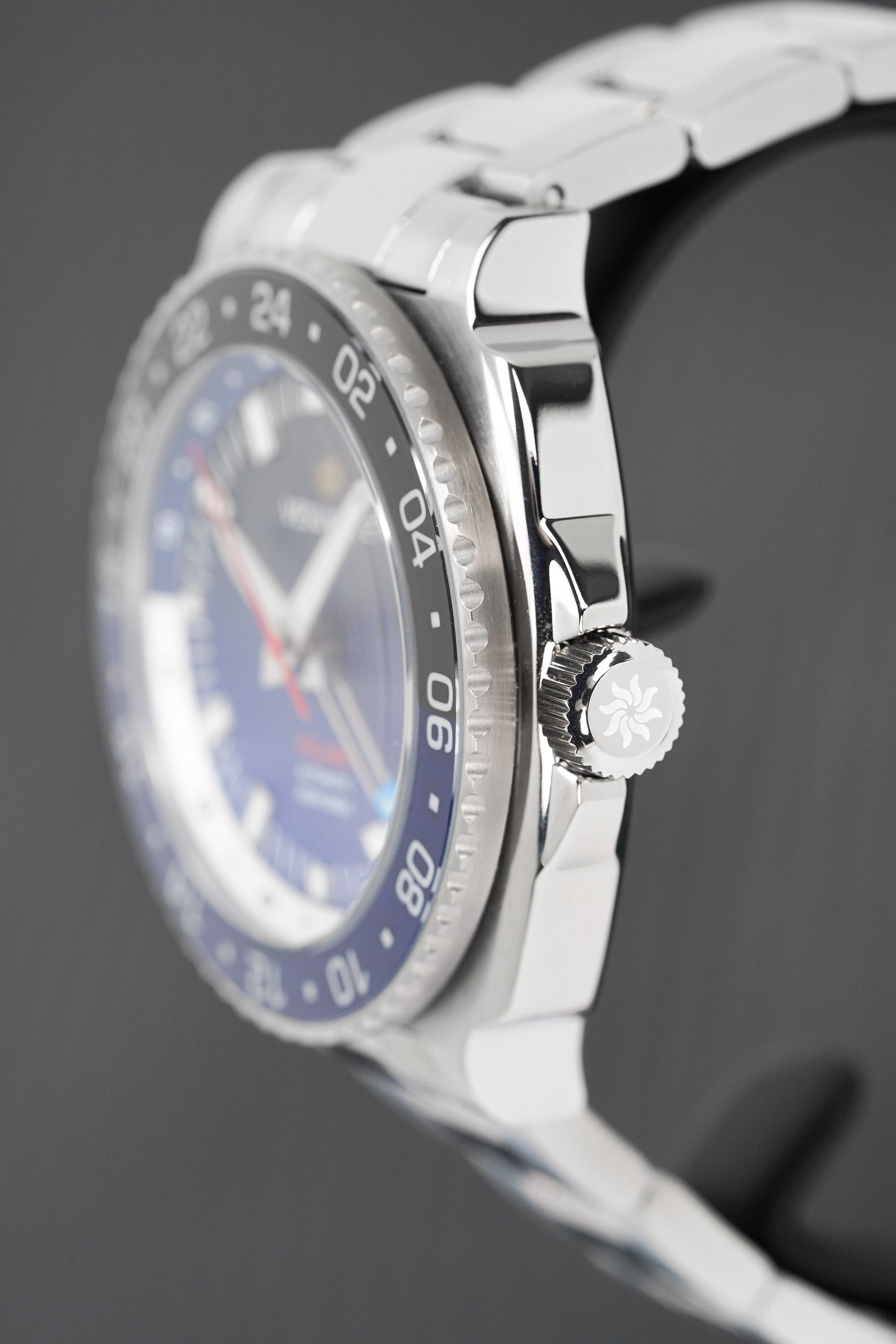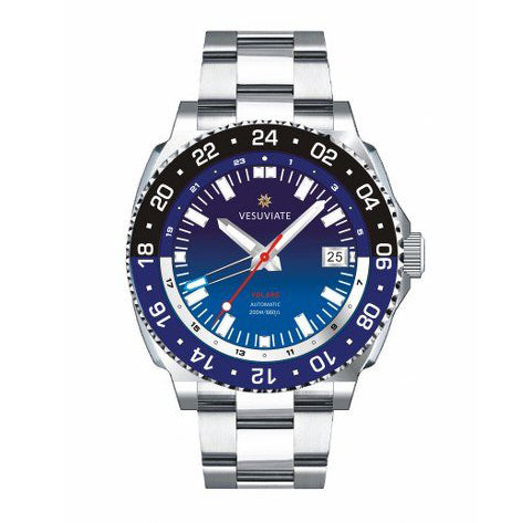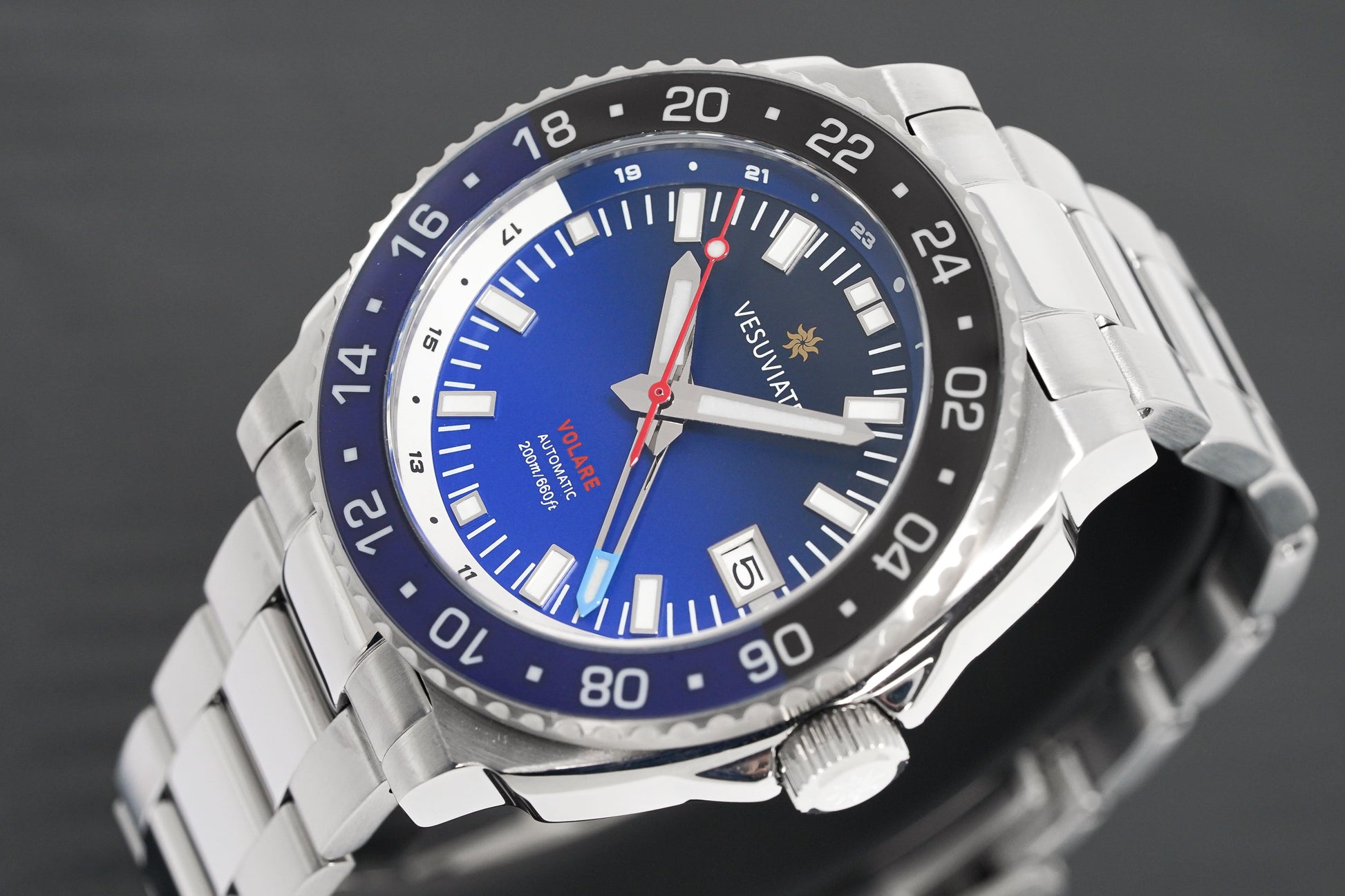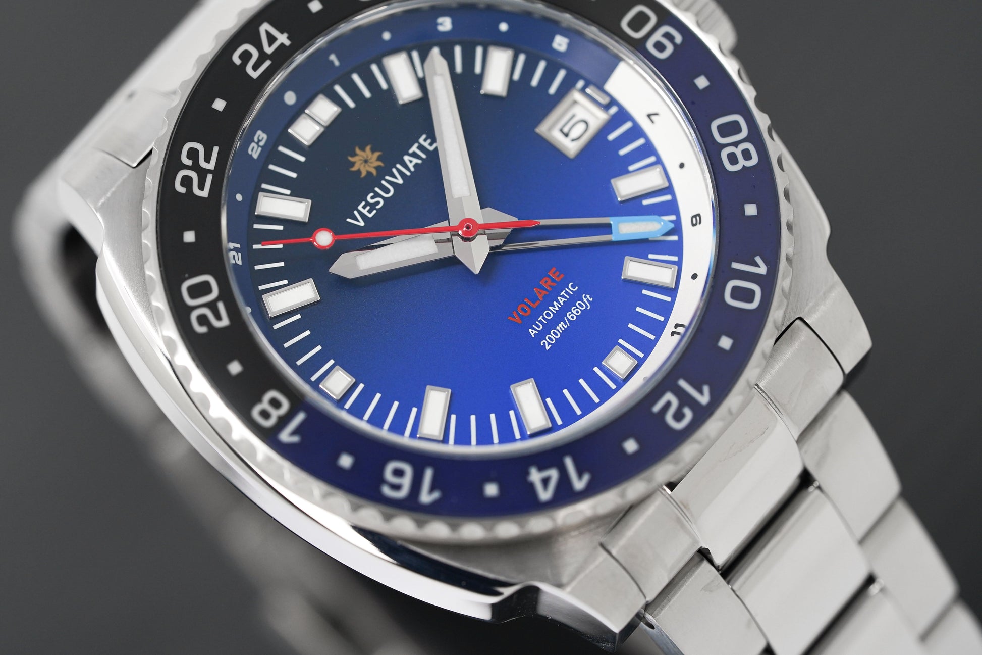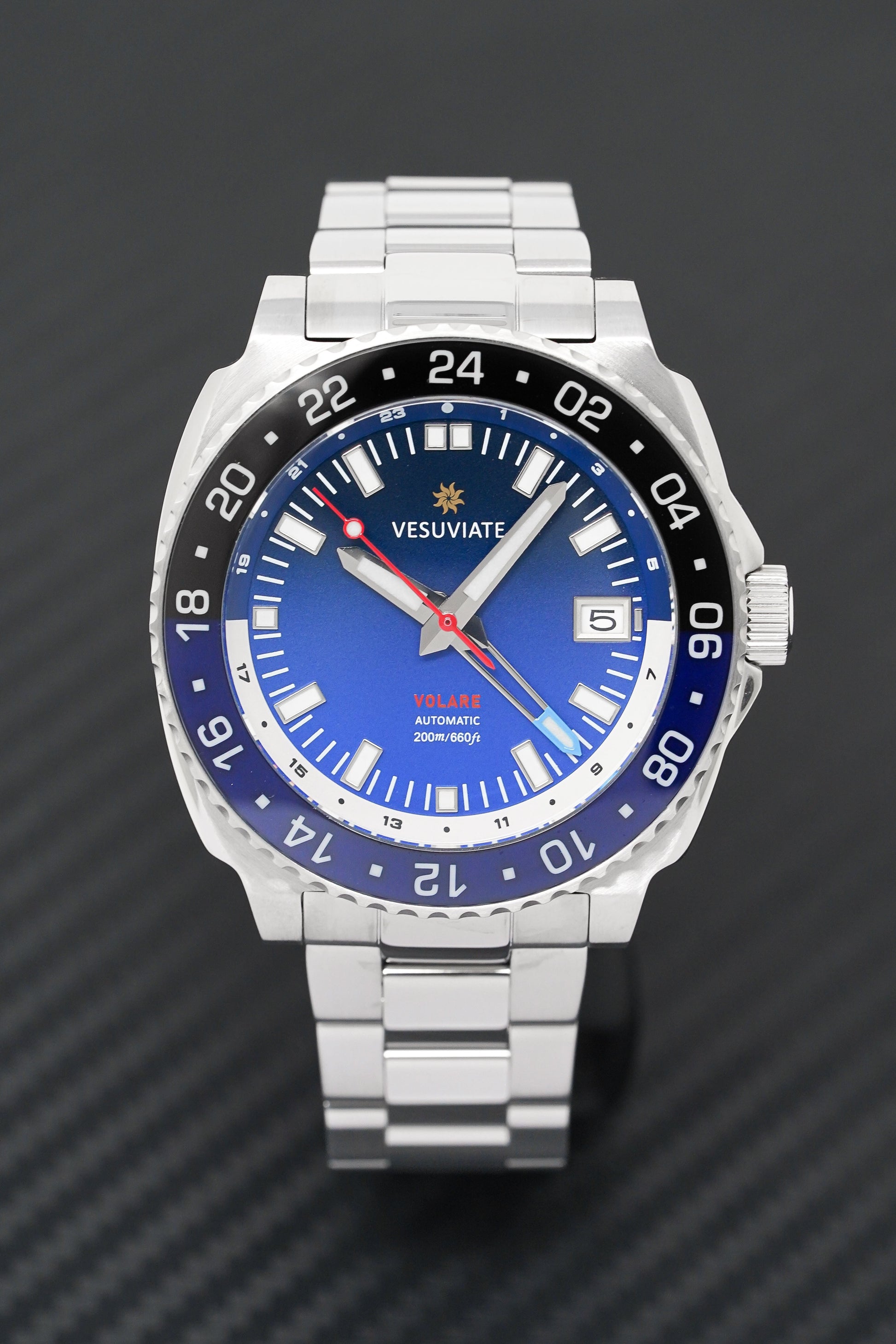 Blue Gradient Dial - Swiss Super-LuminNova BGW9 Hands and Hour Markers - Red Seconds Hand - Blue GMT Luminous Hand - Date Window At 3 O'Clock.
