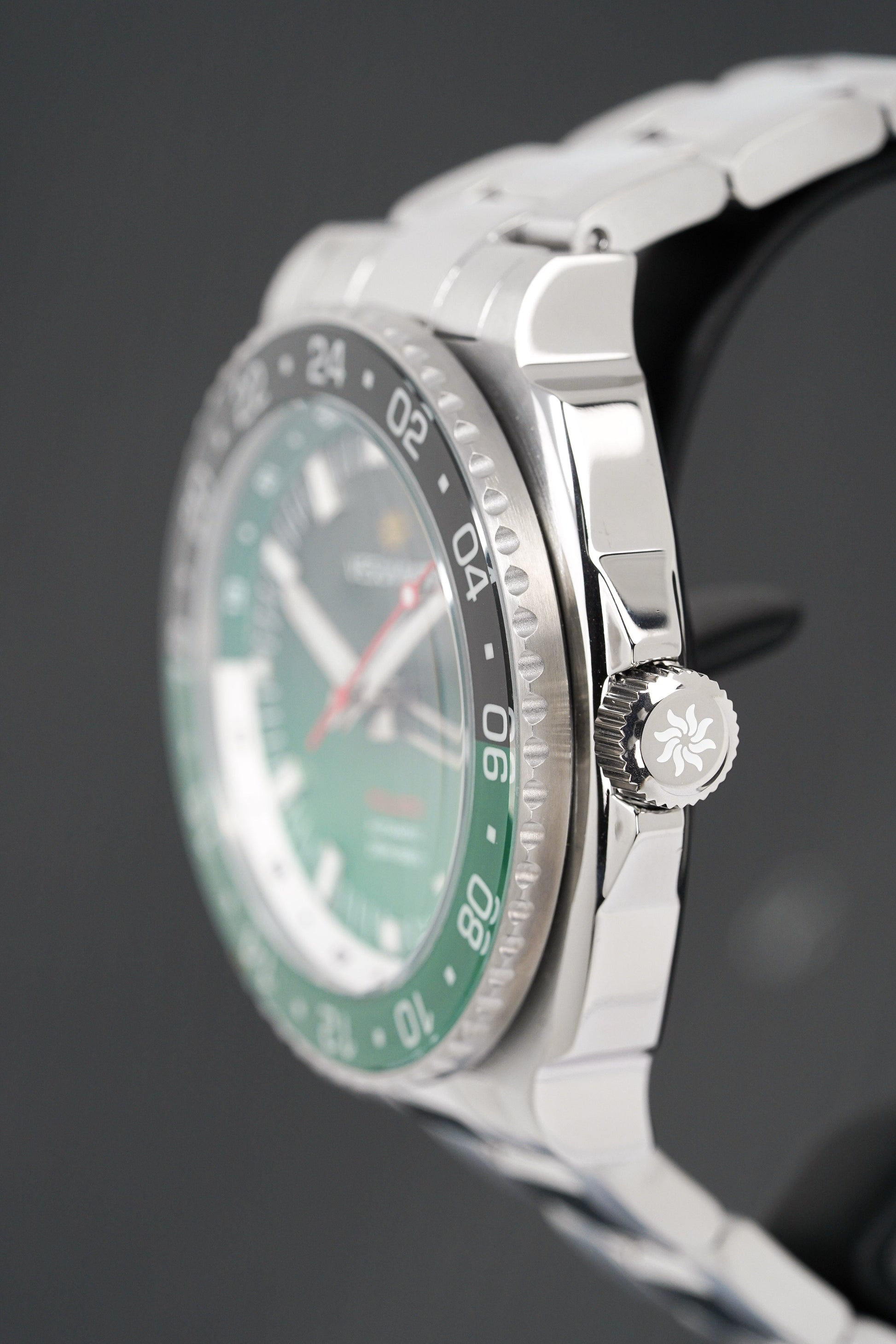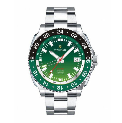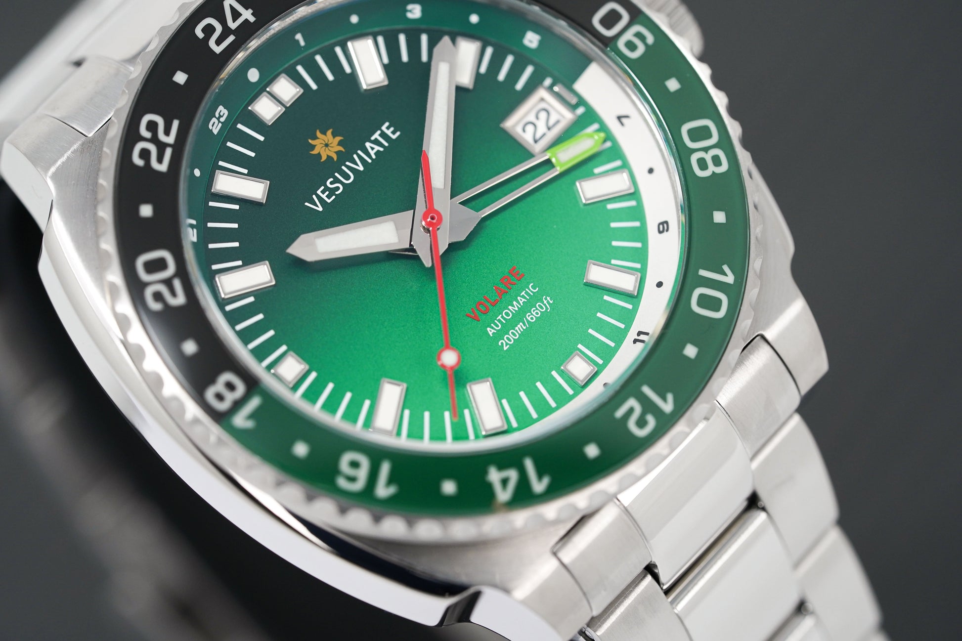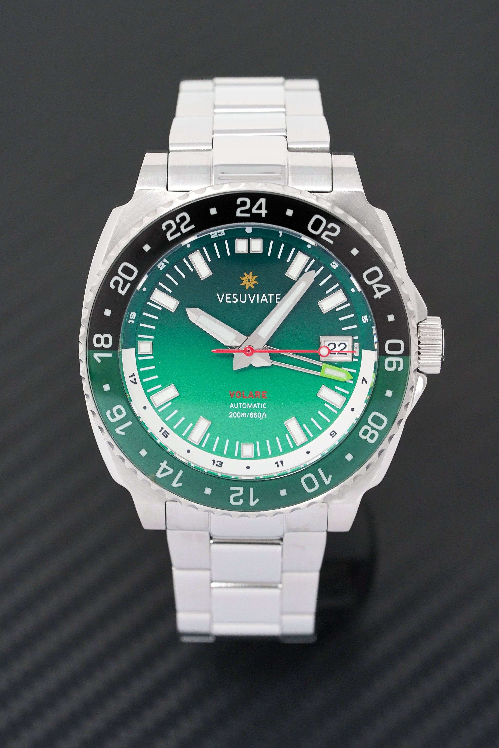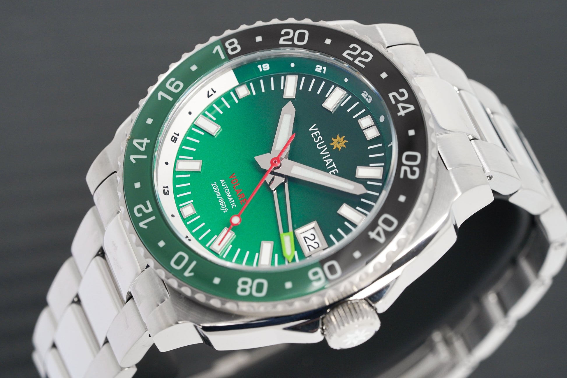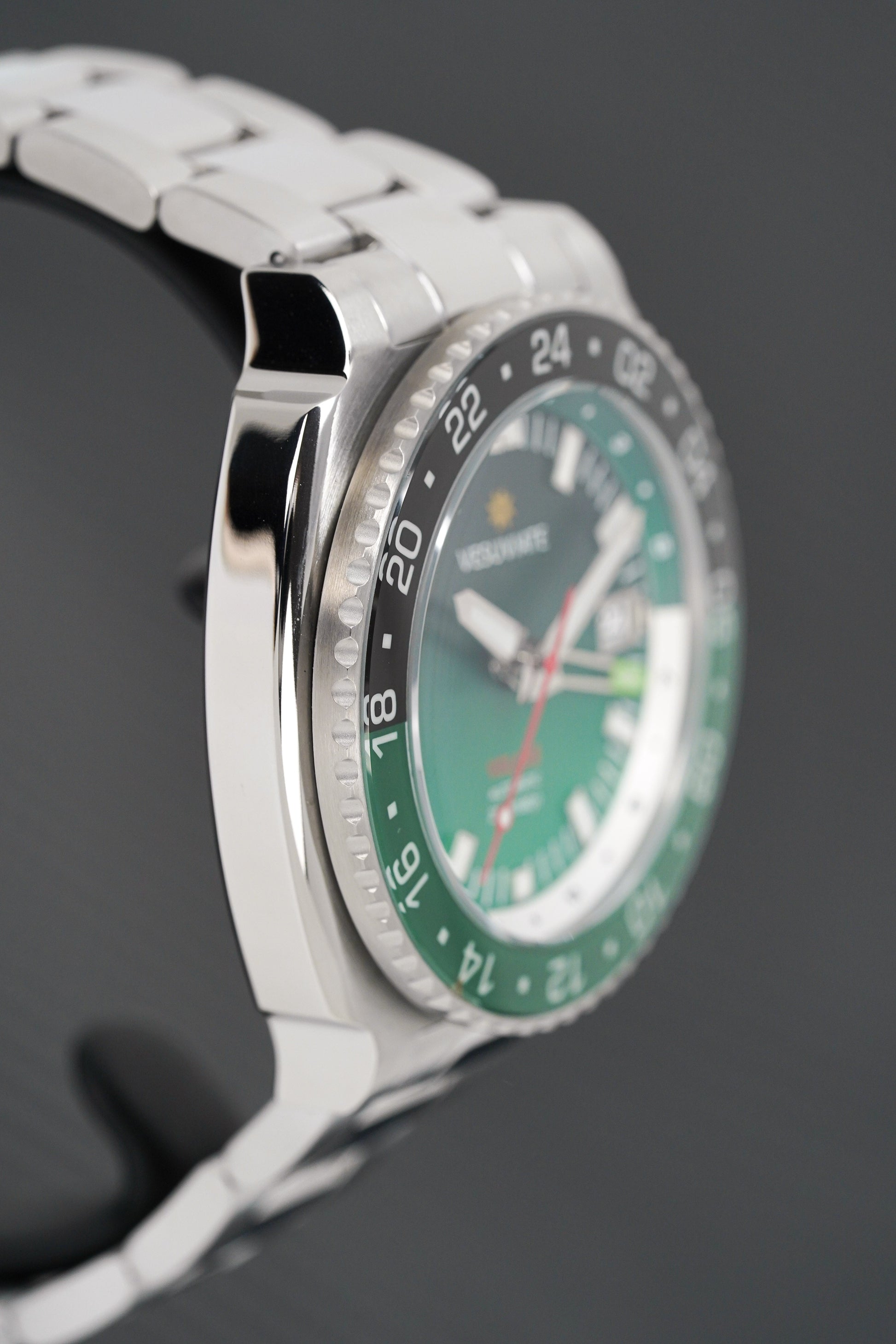 Green Gradient Dial - Swiss Super-LuminNova BGW9 Hands and Hour Markers - Red Seconds Hand - Green GMT Luminous Hand - Date Window At 3 O'Clock.