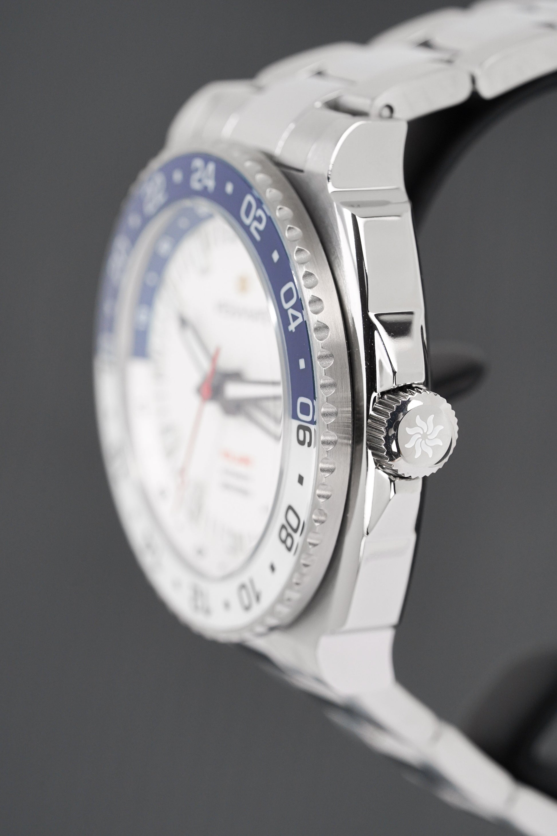 White Dial - Swiss Super-LuminNova BGW9 Hands and Hour Markers - Red Seconds Hand - Blue GMT Luminous Hand - Date Window At 3 O'Clock.