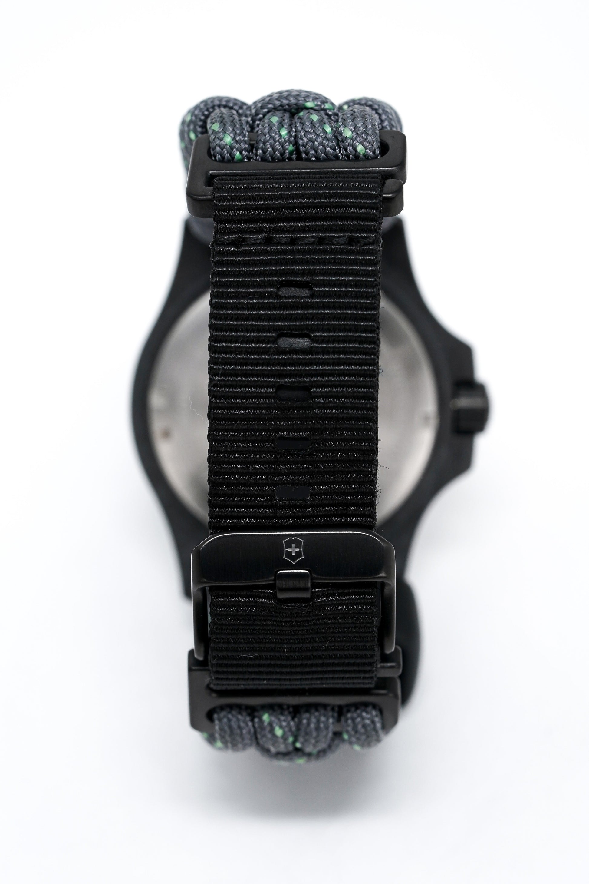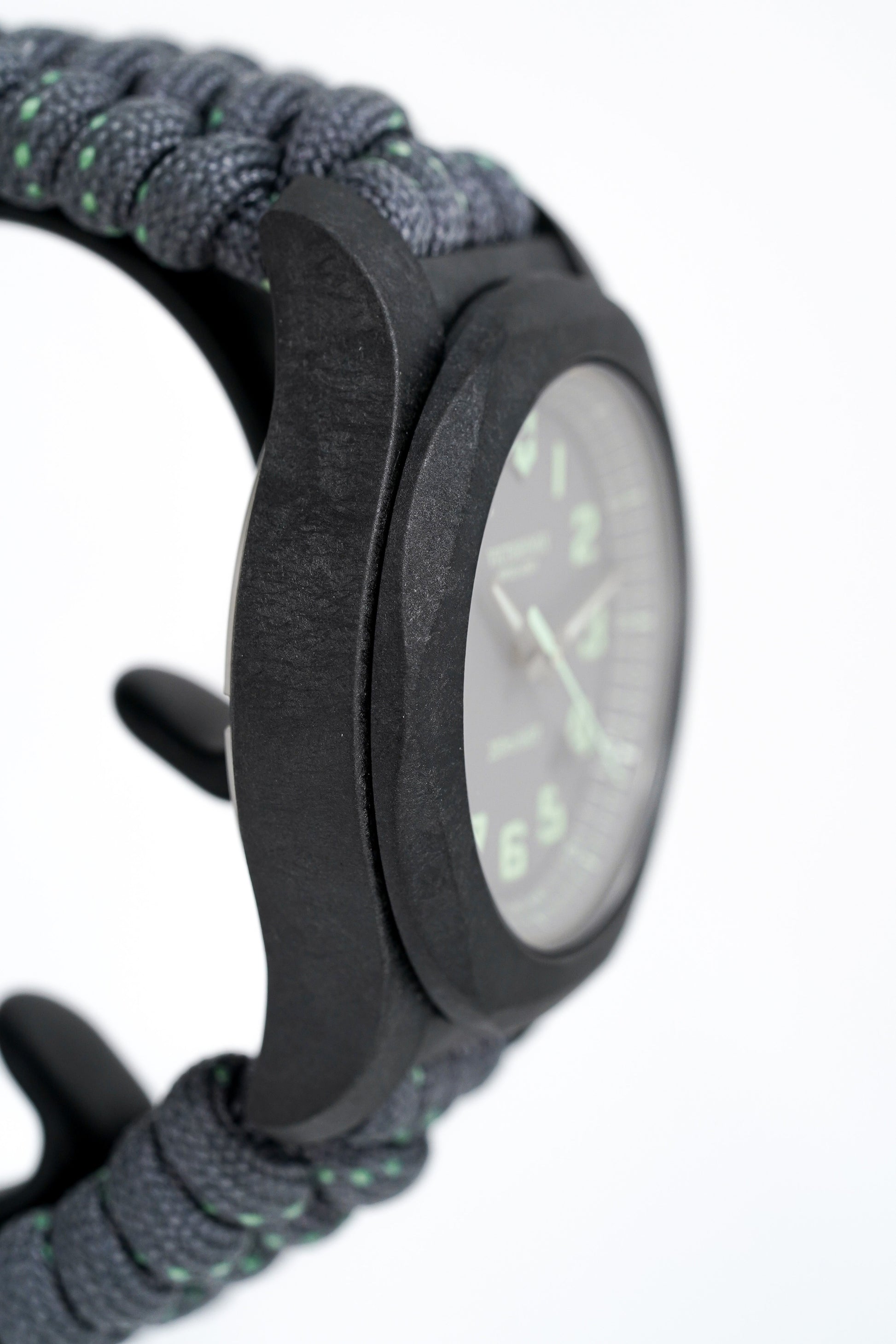21mm Width Grey Nylon Paracord Strap with Green Tracers - Black PVD 316L Black Stainless Steel Pin Buckle - Comes with a Grey Rubber Strap.