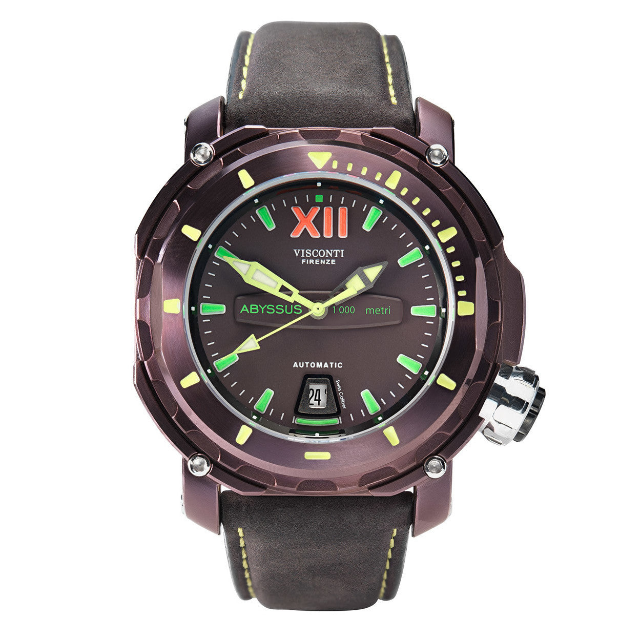 The Abyssus Full-Dive is a professional deep sea diving watch, water-resistant to 100 ATM, the equivalent of 1,000 meters. A watch designed to meet the needs of both professional divers and enthusiasts, the Full-Dive is the latest evolution of the Visconti Abyssus dive collection. Each watch is assembled in Florence Italy using the finest materials and features a Swiss ETA automatic movement, uni-directional rotating bezel