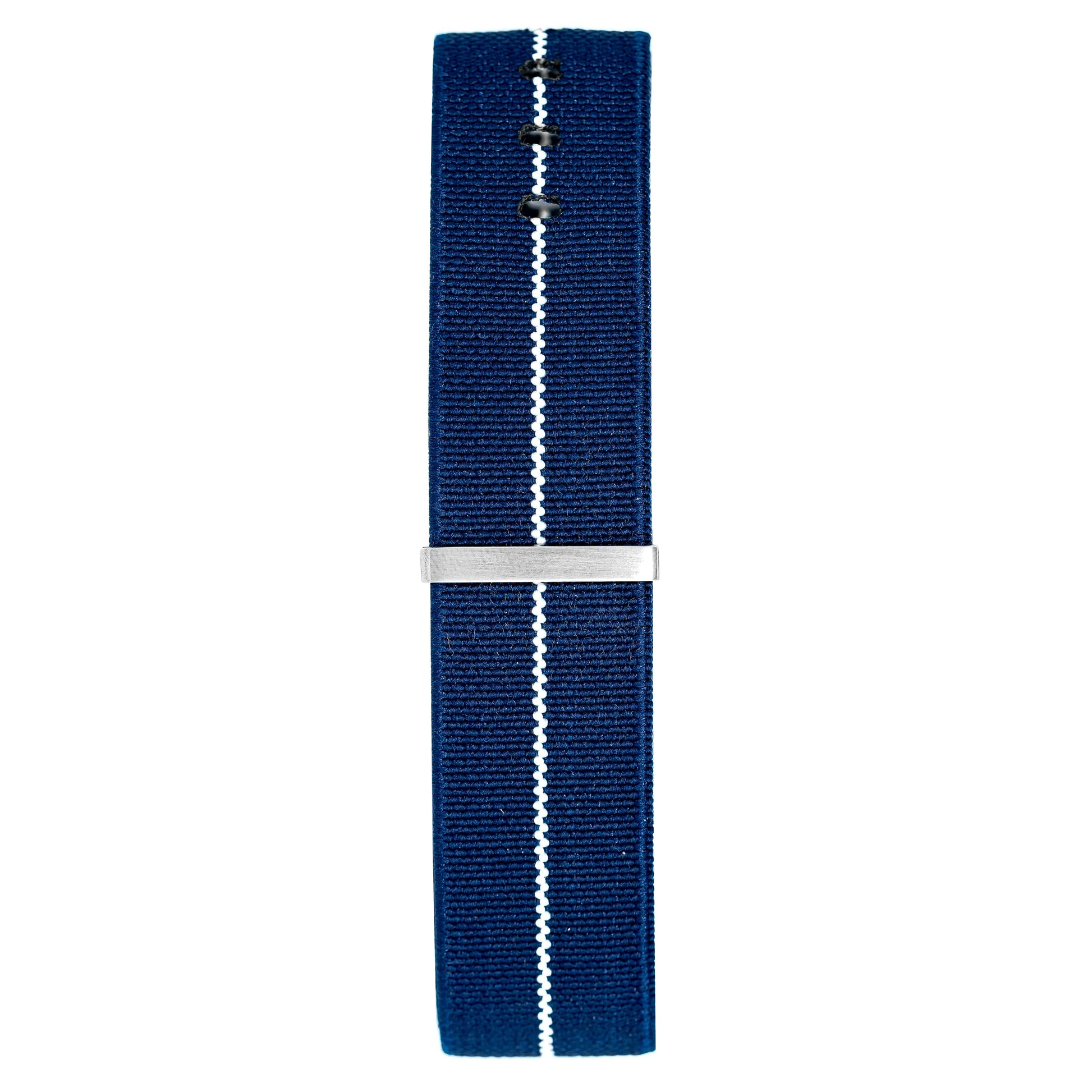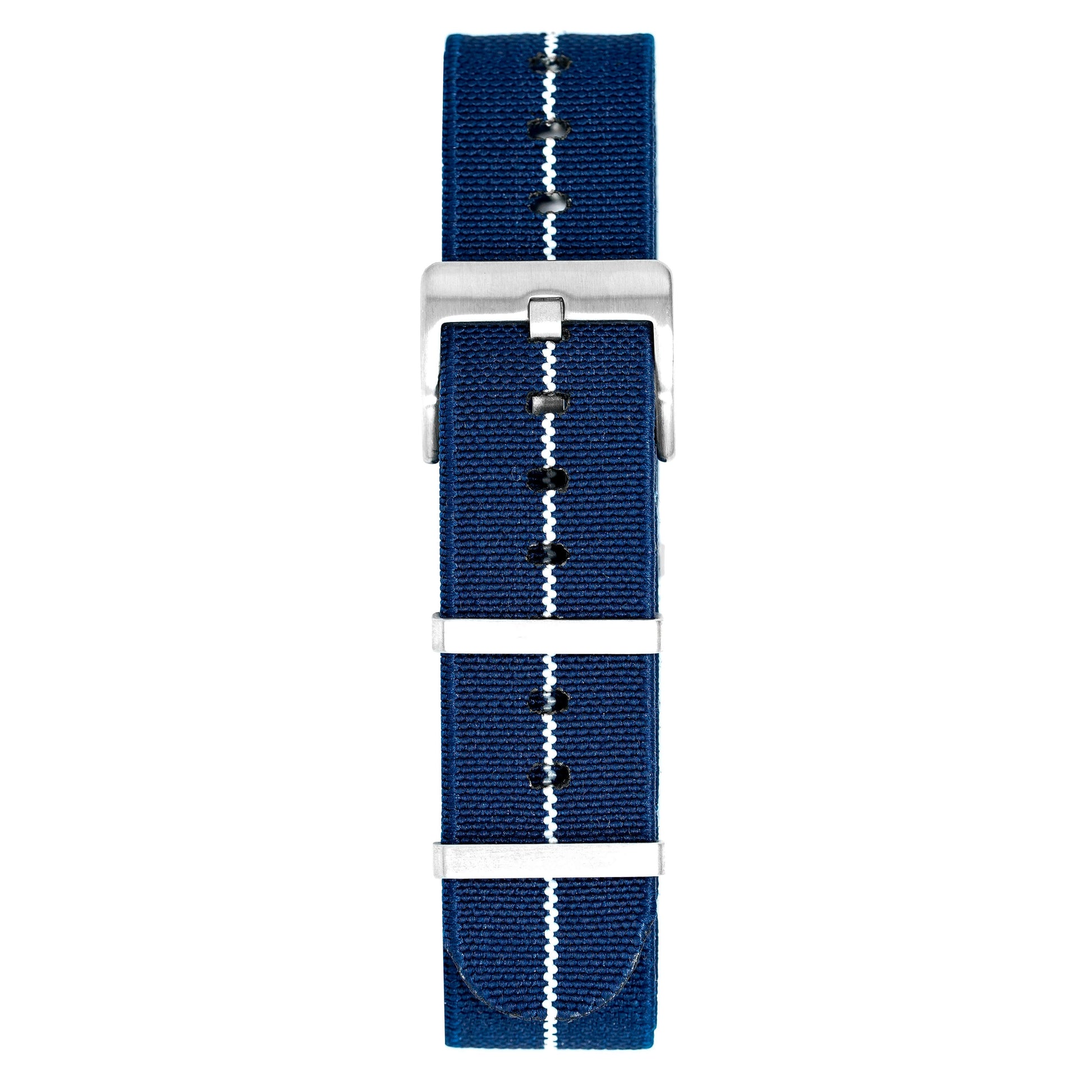 20mm width x 30cm Length Elasticated Nylon Blue Nato Strap with White Line - Fitted with a Stainless Steel Pin Buckle.